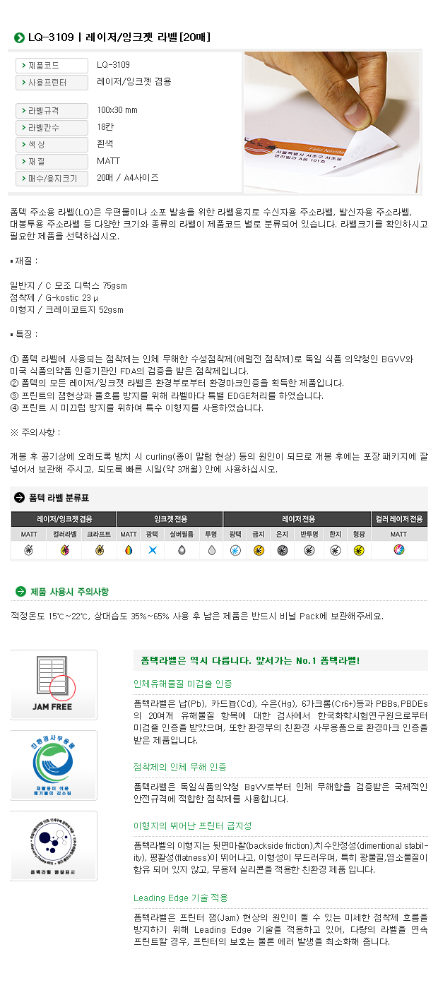 ■ 품명 및 모델명: 주소용 라벨(LS-3109/100매/18칸/폼텍)