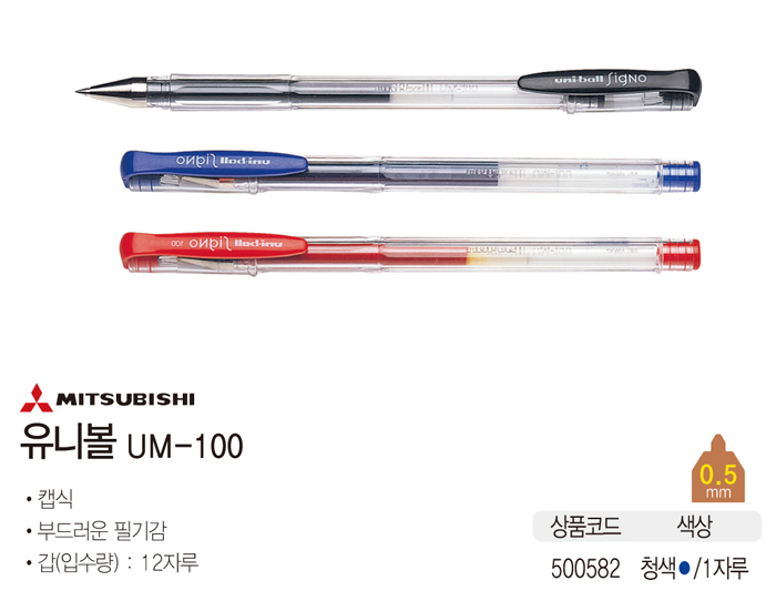 * 제품특징 - 중성펜 - 단위 : 1자루 ■ 품명 및 모델명: Uni-ball(청/0.5/UM-100/1자루/MITSUBISHI) ■ 법에 의한 인증, 허가 등을 받았음을 확인할 수 있는 경우 그에 대한 사항: 해당없음 ■ 제조국 또는 원산지: 일본 ■ 수입여부: 미쯔비시연필한국판매㈜ ■ 안전인증여부: N