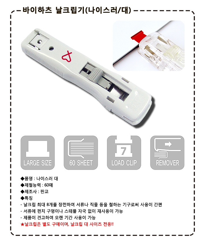 ◎ 상품 상세설명- 날크립날을 장정하여 사용하는 서류 제철기- 제철능력: 킹-80매, 대-60매, 중-40매, 소-20매◎ 상품정보고시■ 법에 의한 인증 사항 - 해당없음■ 제조국 또는 원산지 - 한국■ 수입여부 - 바이하츠■ 안전인증여부 - N