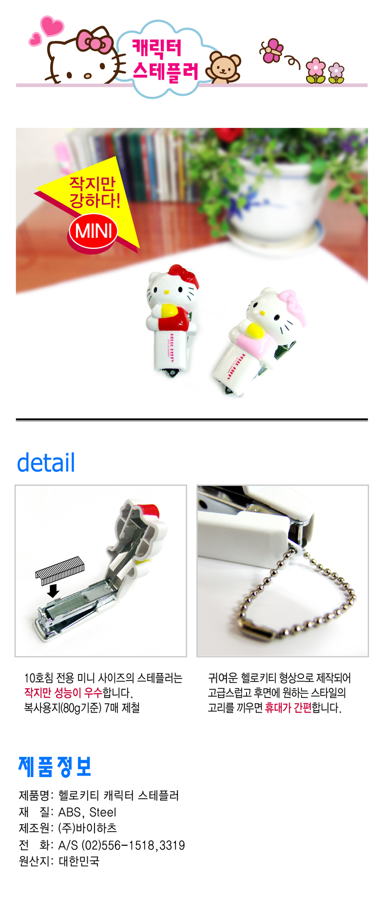 * 10호침 사용 * 10매 제철가능 * 휴대가 간편한 미니 스테플러 ■ 품명 및 모델명: 신)키티캐릭터스테플러(10호/판교) ■ 법에 의한 인증, 허가 등을 받았음을 확인할 수 있는 경우 그에 대한 사항: 해당없음 ■ 제조국 또는 원산지: 국산 ■ 수입여부: 해당없음 ■ 연락처: 02-556-1518 ■ 안전인증여부: 해당없음