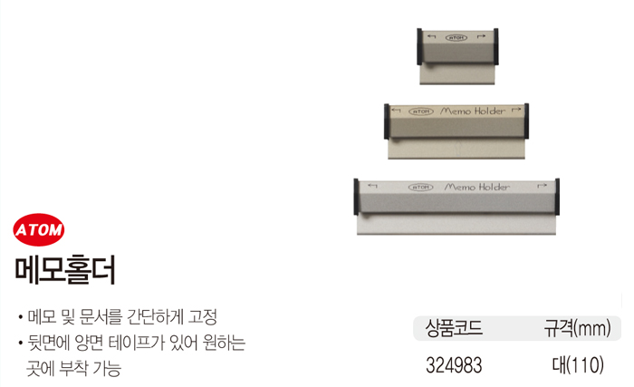 * 메모 및 문서를 간단하게 고정 * 뒤면에 양면 테이프가 있어 원하는 곳에 부착 가능 ■ 품명 및 모델명: 메모홀더(AMH-30/대/110mm/아톰) ■ 법에 의한 인증, 허가 등을 받았음을 확인할 수 있는 경우 그에 대한 사항: 해당없음 ■ 제조국 또는 원산지: 국산 ■ 수입여부: 해당없음 ■ 안전인증여부: 해당없음