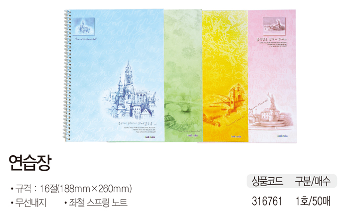 *제조사 :근영사 *원산지 :대한민국 * 규격 : 16절(188*260mm) * 매수 : 약 50매 * 무선내지 * 좌철스프링 노트 ■ 품명 및 모델명: 연습장(1호/근영사) ■ 법에 의한 인증, 허가 등을 받았음을 확인할 수 있는 경우 그에 대한 사항: 해당없음 ■ 제조국 또는 원산지: 국산 ■ 수입여부: 해당없음 ■ 연락처: ㈜오피스큐 / 1577-0096 ■ 안전인증여부: 해당없음