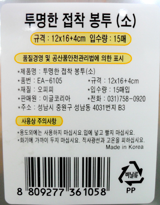 ■ 품명 및 모델명: 투명한 접착봉투(소/120*160mm/15매/Eagle)