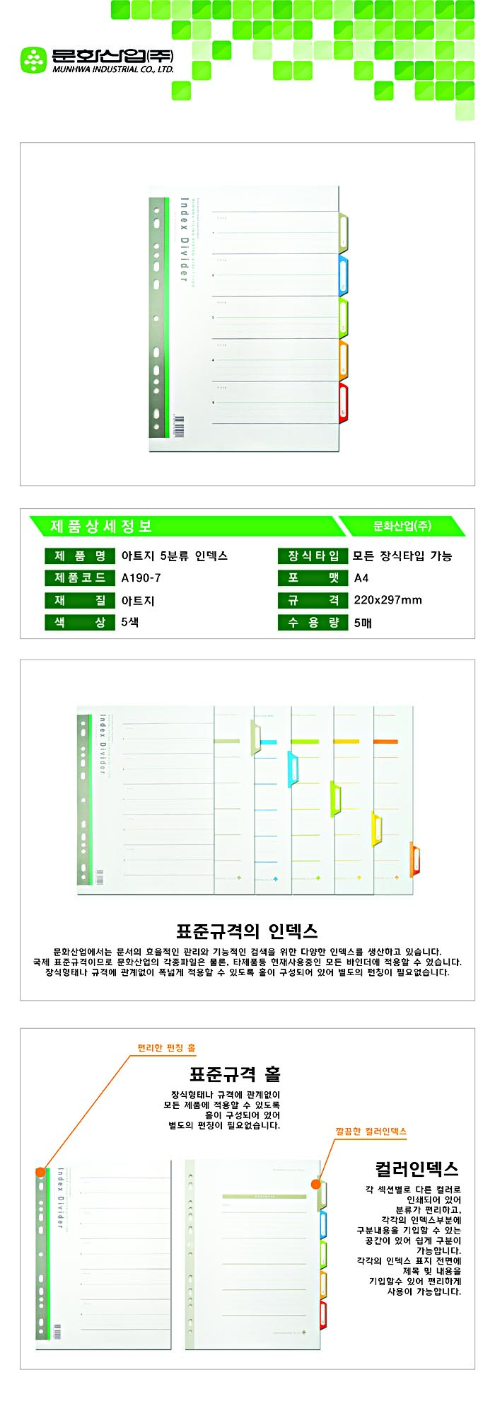 ■ 품명 및 모델명: 바인더인덱스(아트지/5분류/A190-7/문화산업)